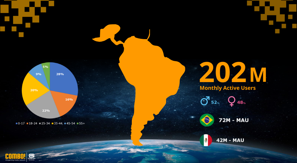 In Latin America, COMBO! reaches over 203 million Monthly Active Users (MAU), with Brazil and Mexico leading the way. Approximately 28% of players are under 18, reflecting a mobile-first, youth-focused gaming culture. Brands aiming to connect in this region should focus on dynamic mobile experiences, social engagement, and content that resonates with young, community-driven players.