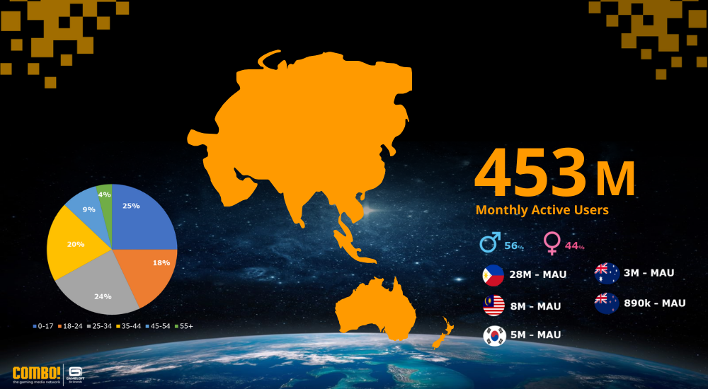 APAC is the largest region for COMBO!, with 452 million monthly players, particularly strong among the 25–34 age group in countries such as the Philippines, Malaysia, and South Korea. This region offers immense scale and an engaged audience, making it an ideal space for brands to launch regional campaigns, influencer collaborations, and immersive experiences that resonate with adult gamers who are culturally connected and digitally active.